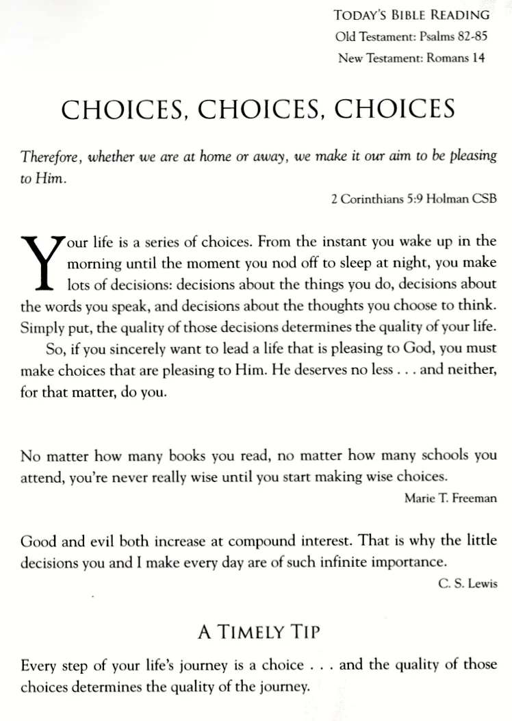 I am traveling this week but thought I’d pass along a devotional I read recently which seemed apropos. It comes from a gem of a book I picked up at CVS while waiting to check out. That decision turned out to be a wise choice indeed as I’ve enjoyed it immensely. The name is Once a Day Every Day for Women by Criswell Freeman. I’m not sure why he specifies women because it’s applicable for everyone. Enjoy!