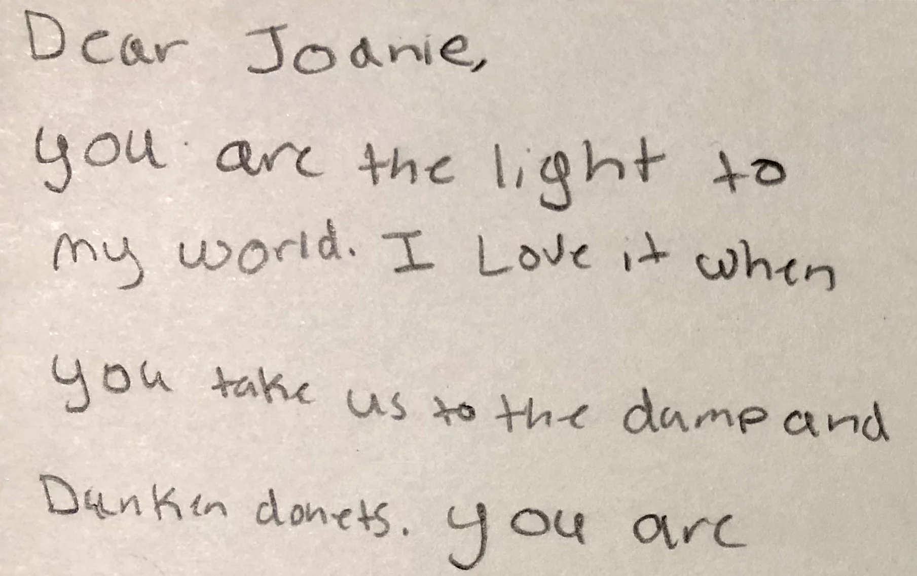 Just hours after I finished writing my last post about my friend leaving a trail of light, I received a precious Godwink. One of my ‘littles’ visiting from Texas handed me a thank you card which began, “Dear Joanie, You are the light in my world. I love when you take us to the dump and Dunkin’ Donuts…” It was a Divine reminder that we don’t have to be doing great things to make a difference. Who knew a trip to the dump could inspire such gratitude?