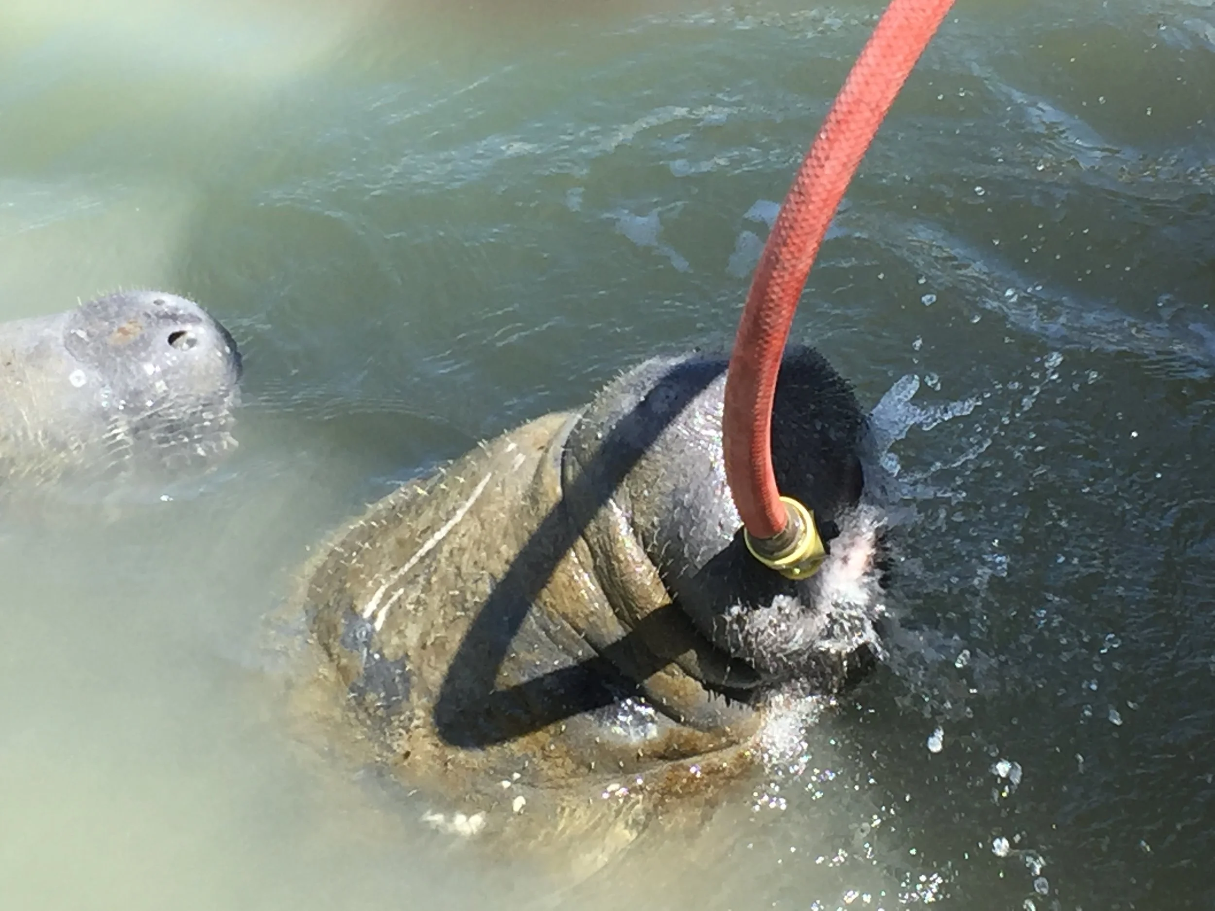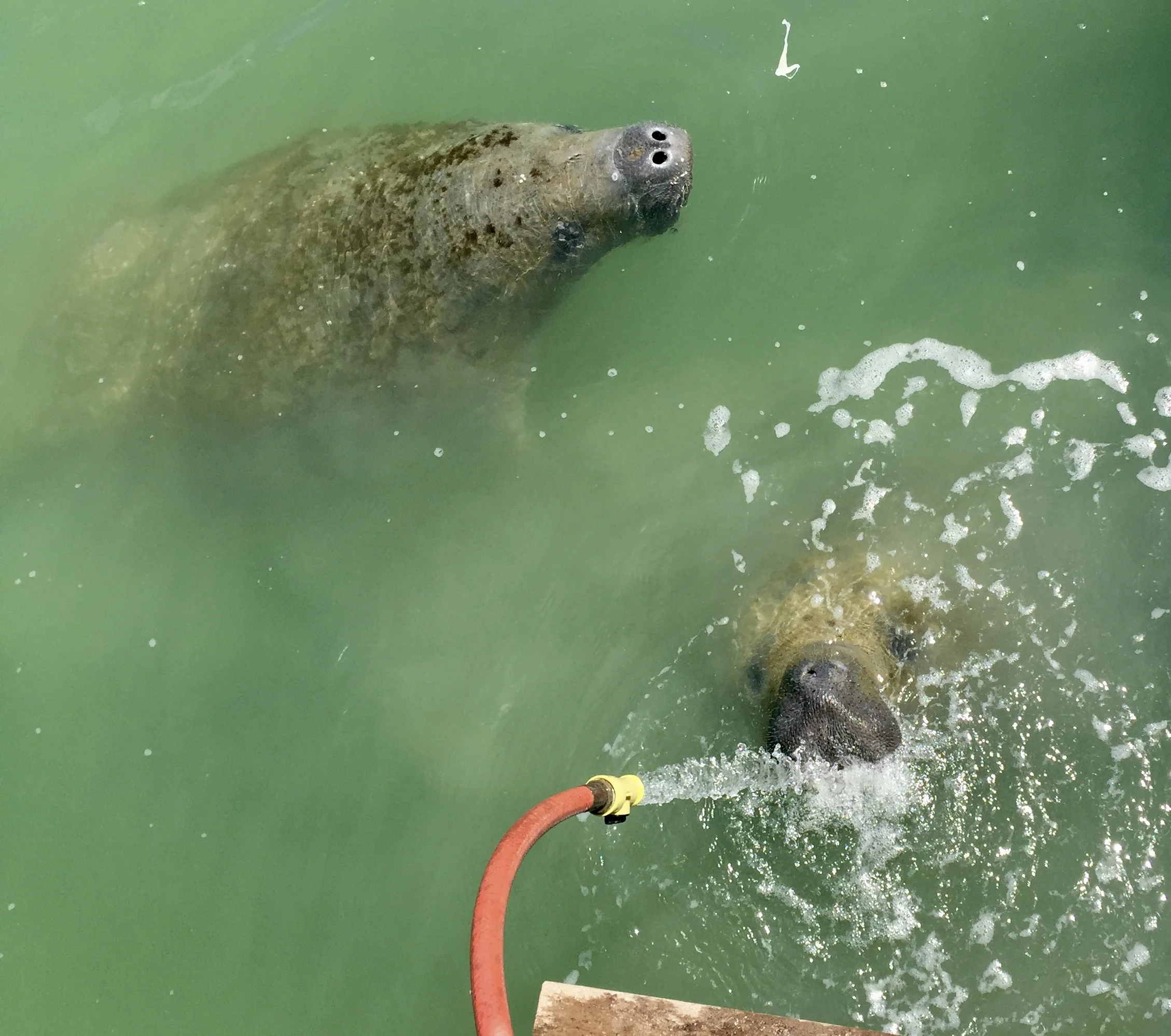 I’ve been visiting Florida for 20 years, and the closest I've gotten to seeing one of these chubby creatures is the manatee mailboxes that are popular in our neighborhood.This week a family of four wandered into the canal behind our house. Someone once told me they like to drink fresh water, and if you hold a hose close to the water, they’ll come drink out of it. Though I was skeptical, I decided to try it. I sat on the dock and lowered the hose searching the canal for them when they popped up at my feet for a drink. It was startling as they are HUGE. I discovered they’re very polite, as I observed them taking turns at the hose. They stayed for about an hour and probably would have hung around longer if I kept the water flowing.