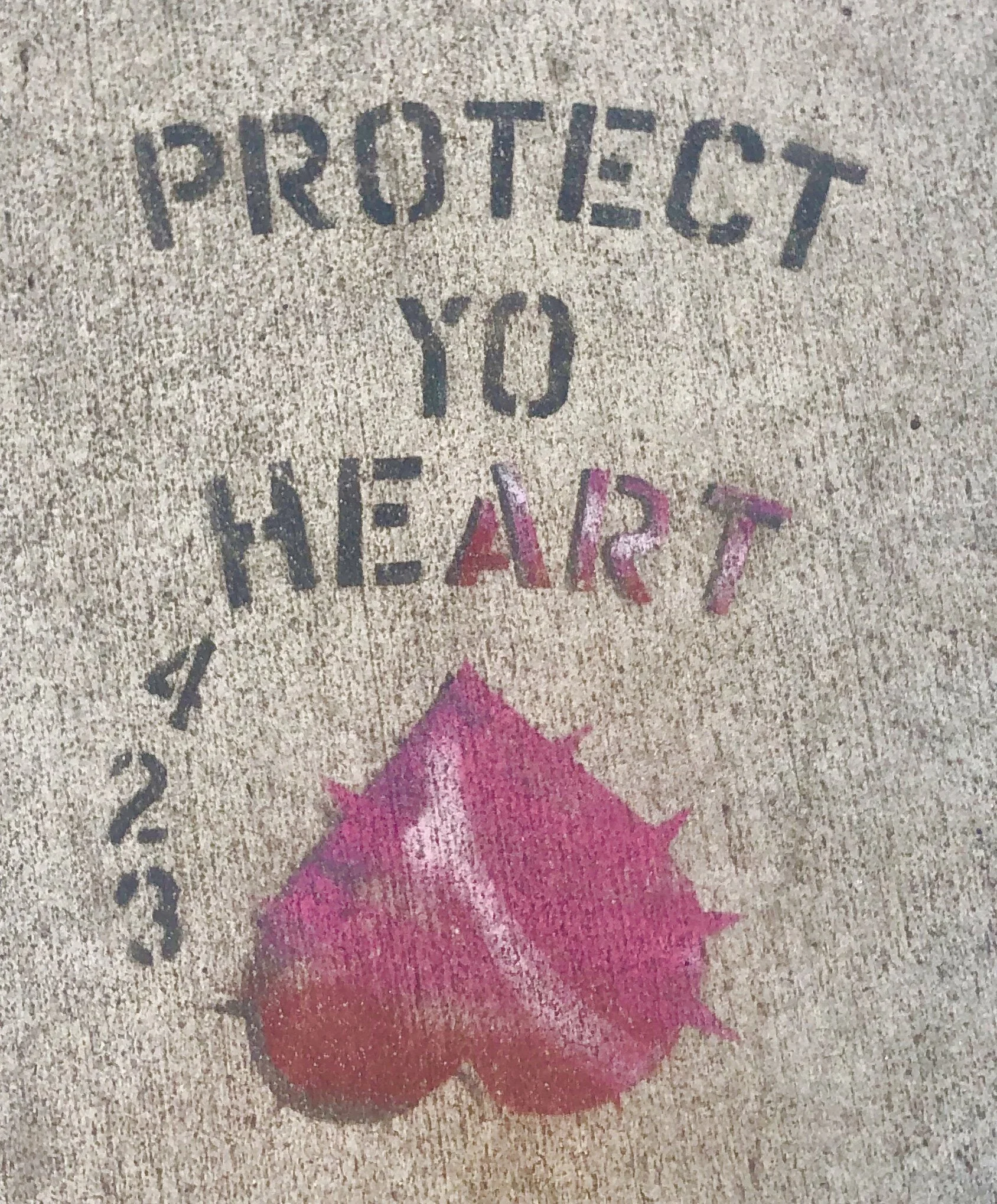 I don’t mean to be an alarmist, but being naïve will only leave you susceptible – physically and spiritually. John Eldridge describes spiritual naivete as “landing on the beaches of Normandy in the early hours of D-day with a lawn chair and a book to read. We are that unprepared for our lives.” Coincidentally, as I was walking in NY last week, I came across a number of sidewalk stencils reminding me to be diligent in protecting my heart. Here amidst the chaos of the city was a visual Bible lesson taken directly from Proverbs 4:23, which states “Above all else, guard your heart for everything you do flows from it.” As I stood on that stencil, I thought of my own beliefs, which may not be stenciled on the sidewalk but are certainly tattooed on my heart. When I am grounded in faith, the peace of God, which transcends all understanding, will guard your hearts and your minds in Christ Jesus. (Philipians 4:7)