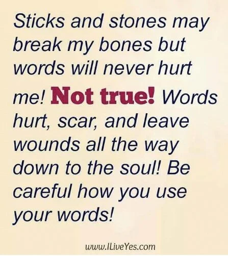 The well-known rhyme from childhood falsely states that “Sticks and stones will break your bones but names will never harm you.” Sound familiar? How many times did your mother recite this age-old rhyme to you? Growing up (let’s call it) chubby, mine had occasion to use it plenty. Words like Fats, Load, Tubs or my brothers’ personal favorite, Gastank, were part of my daily life. They were teasing of course, but their words stuck with me. Even at 62 they echo in my mind when I look in the mirror. I don’t know who authored that rhyme, but the truth is, words do hurt. In fact, I’d say more people are wounded by words everyday than any other weapon. Words are among one of the most destructive weapons of mankind. Marriages have been ruined, wars started, churches broken, families destroyed, nations divided – all without any weapons other than words being drawn.